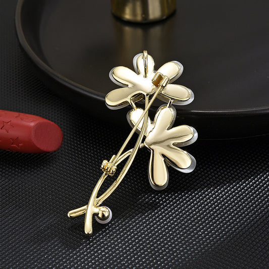 Freshwater Pearl Zircon Gold Leaf Brooch