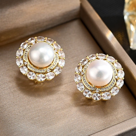 Freshwater Pearl Round Full Zirconia Stud Earrings